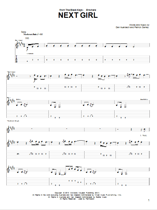 Download or print The Black Keys Next Girl sheet music, chords and digital score arranged for Guitar Tab. This Blues score includes 6 page(s).