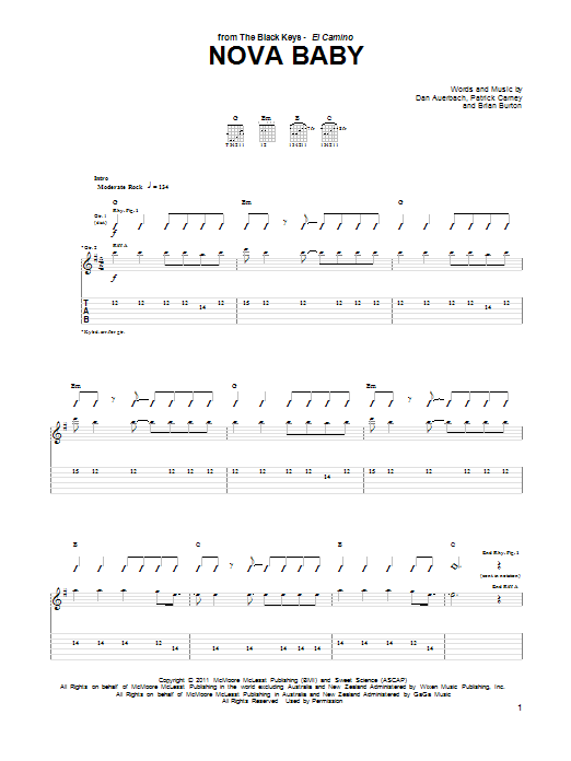 Download or print The Black Keys Nova Baby sheet music, chords and digital score arranged for Guitar Tab. This Pop score includes 6 page(s).
