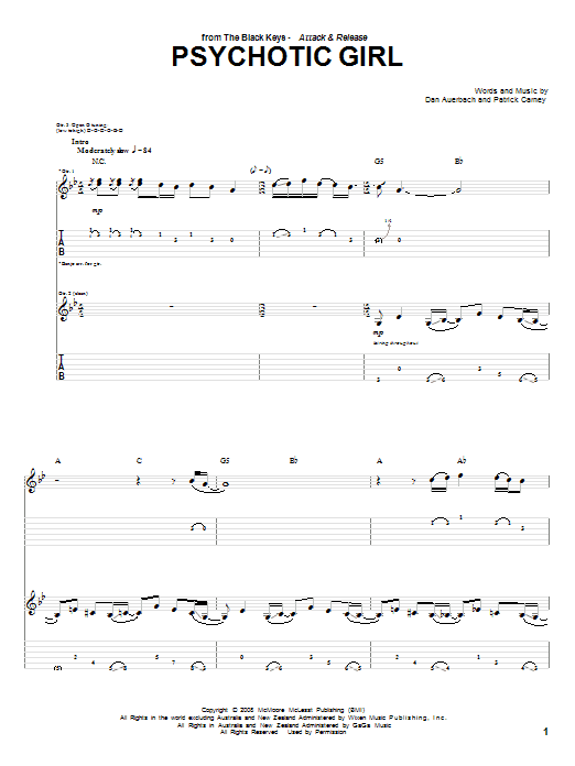 Download or print The Black Keys Psychotic Girl sheet music, chords and digital score arranged for Guitar Tab. This Pop score includes 12 page(s).