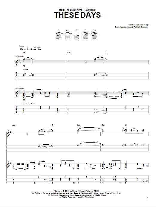 Download or print The Black Keys These Days sheet music, chords and digital score arranged for Guitar Tab. This Blues score includes 9 page(s).
