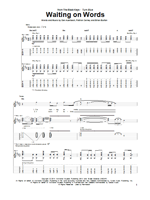 Download or print The Black Keys Waiting On Words sheet music, chords and digital score arranged for Guitar Tab. This Pop score includes 8 page(s).