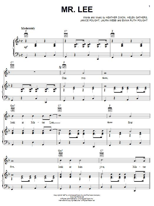 Download or print The Bobbettes Mr. Lee sheet music, chords and digital score arranged for Piano, Vocal & Guitar Chords (Right-Hand Melody). This Pop score includes 4 page(s).