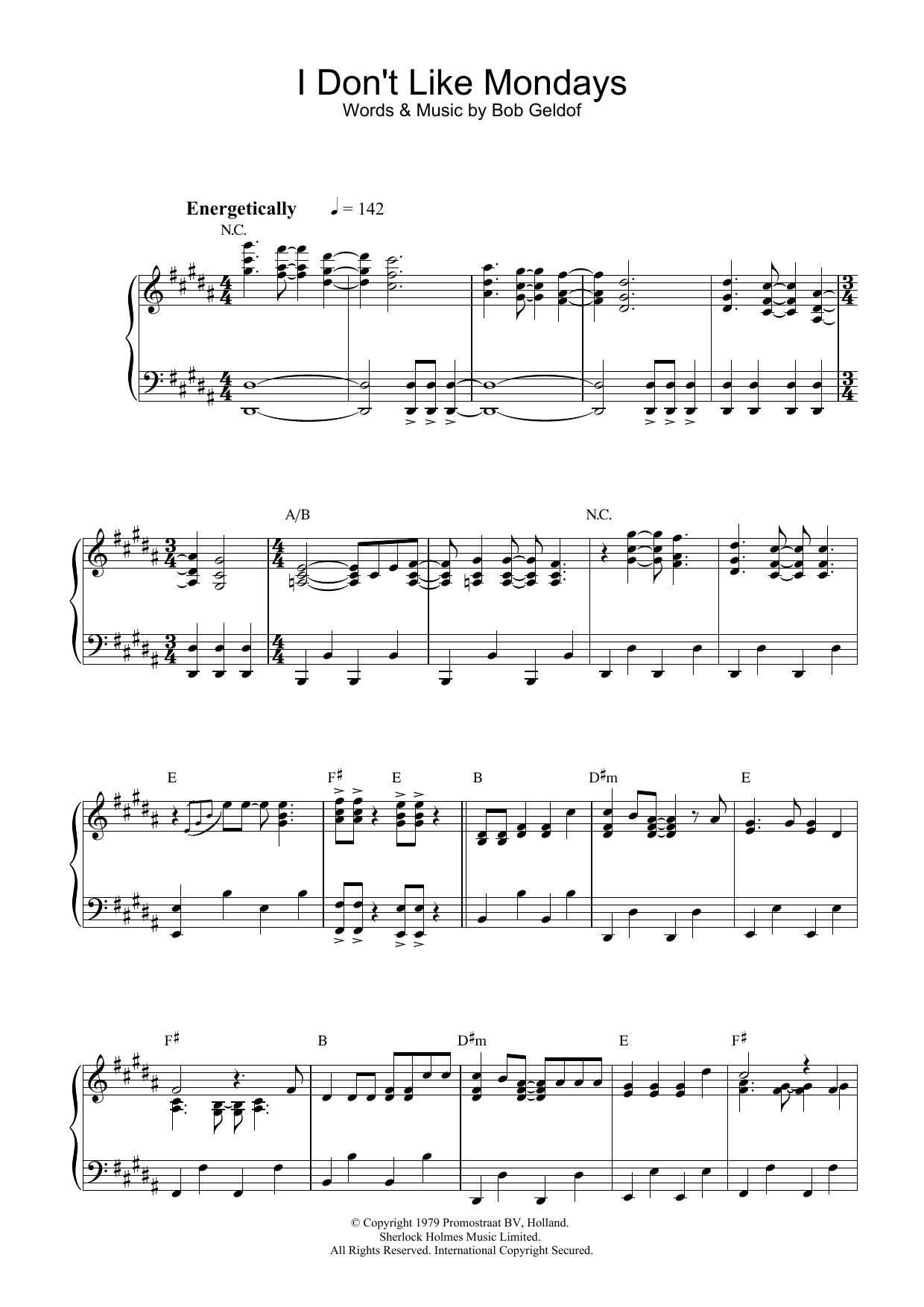Download or print The Boomtown Rats I Don't Like Mondays sheet music, chords and digital score arranged for Piano, Vocal & Guitar Chords (Right-Hand Melody). This Pop score includes 10 page(s).