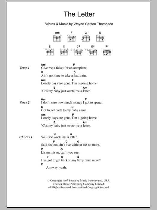 Download or print The Box Tops The Letter sheet music, chords and digital score arranged for Piano Chords/Lyrics. This Pop score includes 2 page(s).