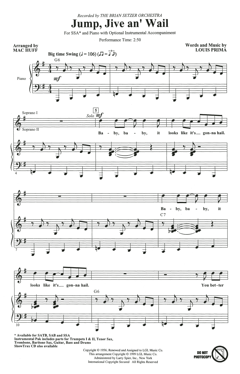 Download or print The Brian Setzer Orchestra Jump, Jive An' Wail (arr. Mac Huff) sheet music, chords and digital score arranged for SAB Choir. This Jazz score includes 11 page(s).