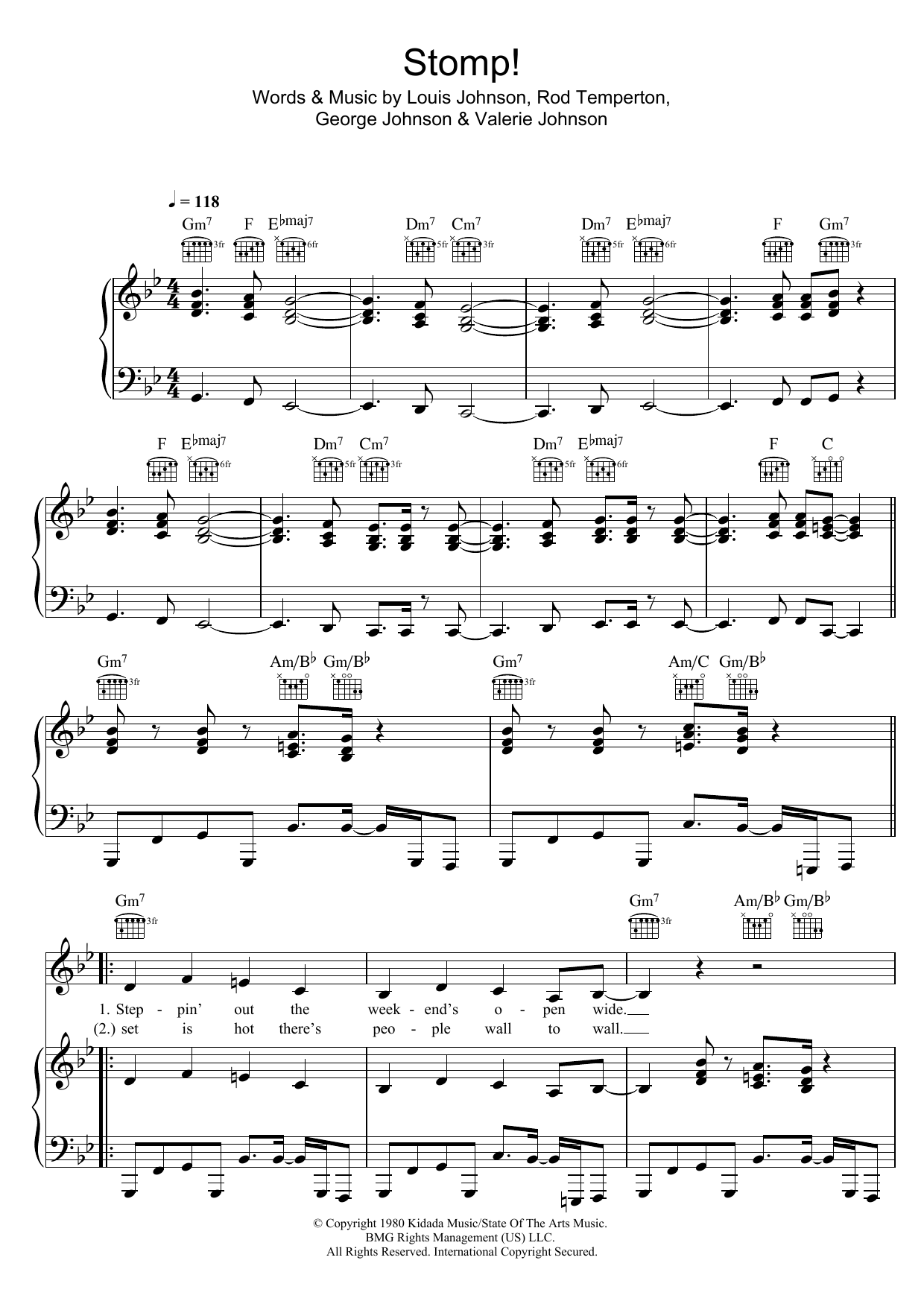 Download or print The Brothers Johnson Stomp! sheet music, chords and digital score arranged for Piano, Vocal & Guitar Chords. This Disco score includes 7 page(s).