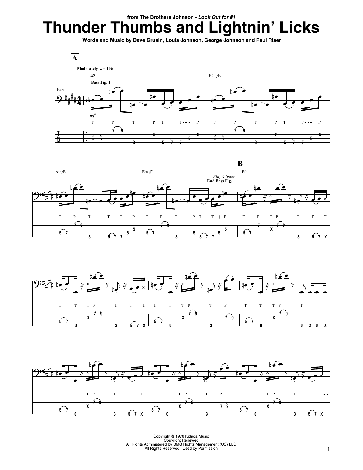 Download or print The Brothers Johnson Thunder Thumbs And Lightnin' Licks sheet music, chords and digital score arranged for Bass Guitar Tab. This Funk score includes 7 page(s).