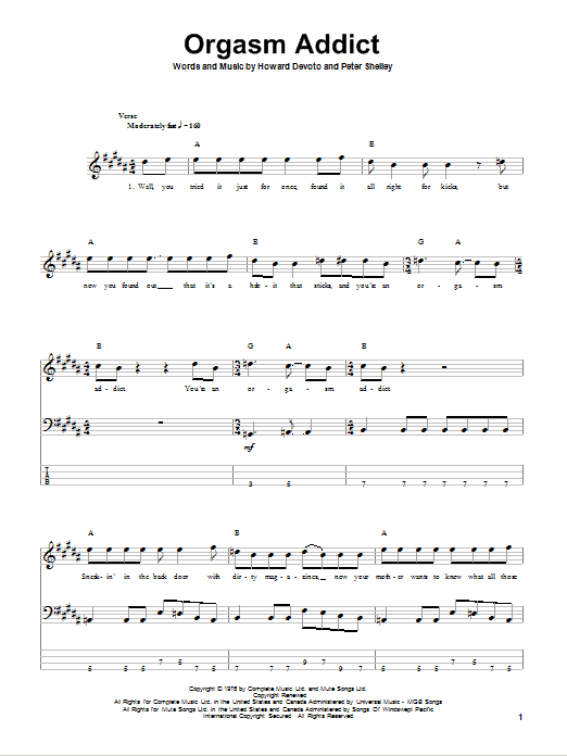 Download or print The Buzzcocks Orgasm Addict sheet music, chords and digital score arranged for Bass Guitar Tab. This Pop score includes 6 page(s).