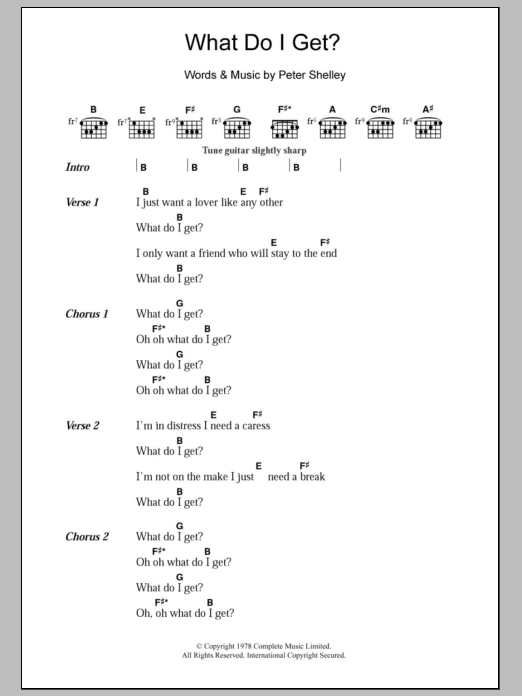 Download or print The Buzzcocks What Do I Get? sheet music, chords and digital score arranged for Guitar Chords/Lyrics. This Rock score includes 3 page(s).