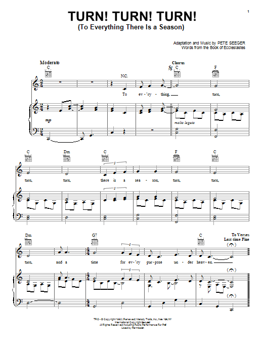 Download or print Pete Seeger Turn! Turn! Turn! (To Everything There Is A Season) sheet music, chords and digital score arranged for Piano, Vocal & Guitar Chords (Right-Hand Melody). This Folk score includes 4 page(s).