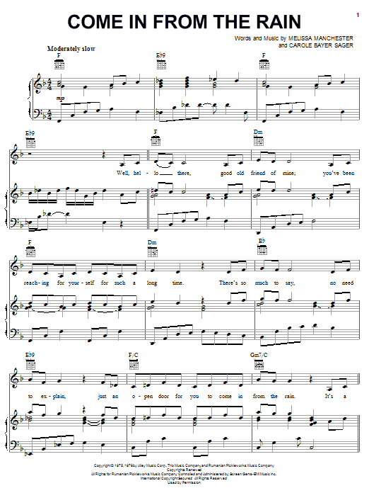 Download or print Captain & Tennille Come In From The Rain sheet music, chords and digital score arranged for Piano, Vocal & Guitar Chords (Right-Hand Melody). This Film/TV score includes 3 page(s).