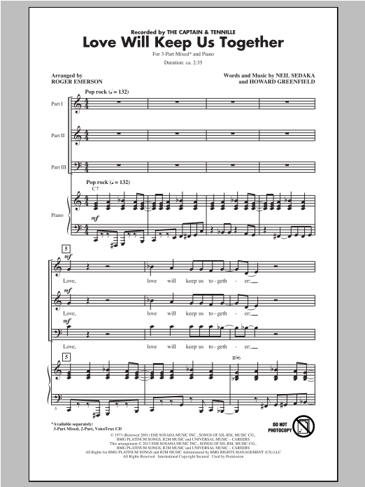 Download or print Roger Emerson Love Will Keep Us Together sheet music, chords and digital score arranged for 3-Part Mixed Choir. This Concert score includes 10 page(s).