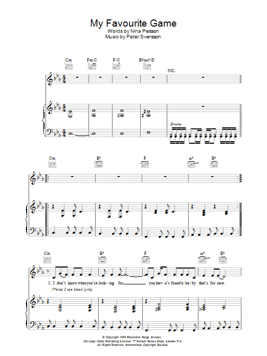 Download or print The Cardigans My Favourite Game sheet music, chords and digital score arranged for Guitar Chords/Lyrics. This Pop score includes 2 page(s).