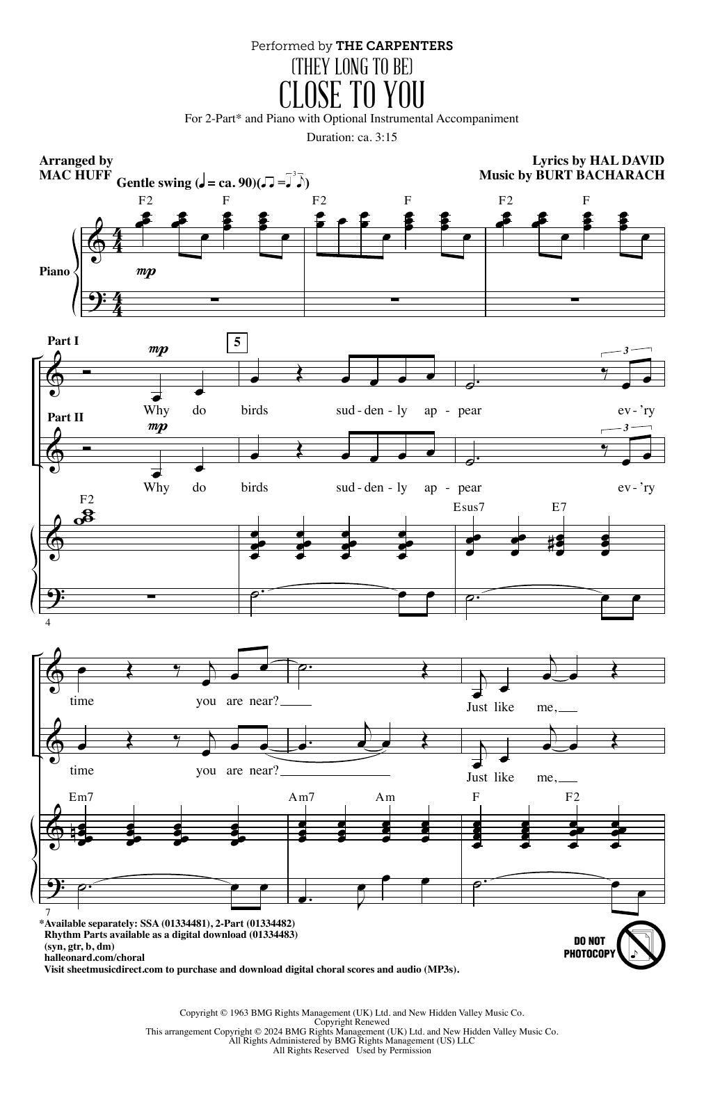 Quick facts (They Long To Be) Close To You (arr. Mac Huff) about digital sheet music