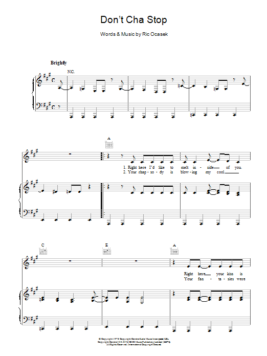 Download or print The Cars Don't Cha Stop sheet music, chords and digital score arranged for Piano, Vocal & Guitar Chords. This Pop score includes 4 page(s).