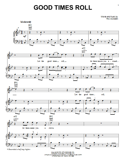 Download or print The Cars Good Times Roll sheet music, chords and digital score arranged for Piano, Vocal & Guitar Chords (Right-Hand Melody). This Pop score includes 5 page(s).