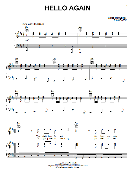 Download or print The Cars Hello Again sheet music, chords and digital score arranged for Piano, Vocal & Guitar Chords (Right-Hand Melody). This Pop score includes 8 page(s).