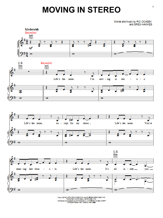 Download or print The Cars Moving In Stereo sheet music, chords and digital score arranged for Piano, Vocal & Guitar Chords (Right-Hand Melody). This Pop score includes 3 page(s).