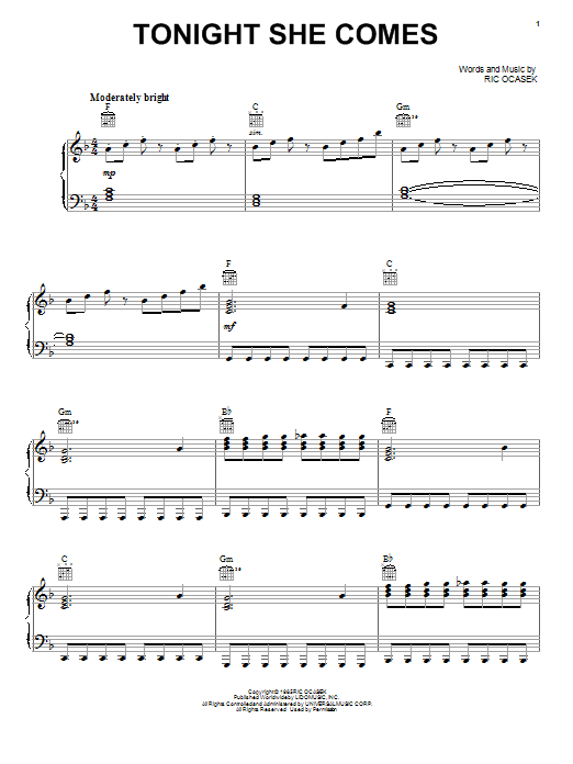 Download or print The Cars Tonight She Comes sheet music, chords and digital score arranged for Piano, Vocal & Guitar Chords. This Pop score includes 9 page(s).