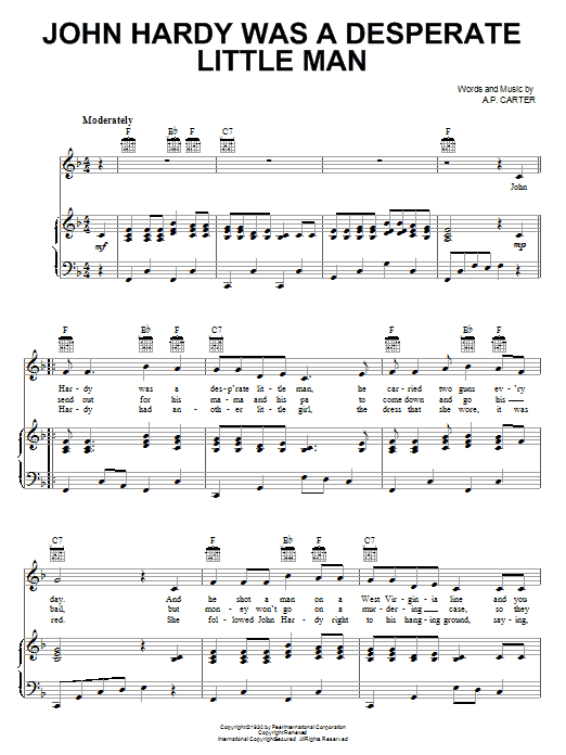Download or print The Carter Family John Hardy Was A Desperate Little Man sheet music, chords and digital score arranged for Piano, Vocal & Guitar Chords (Right-Hand Melody). This Blues score includes 2 page(s).
