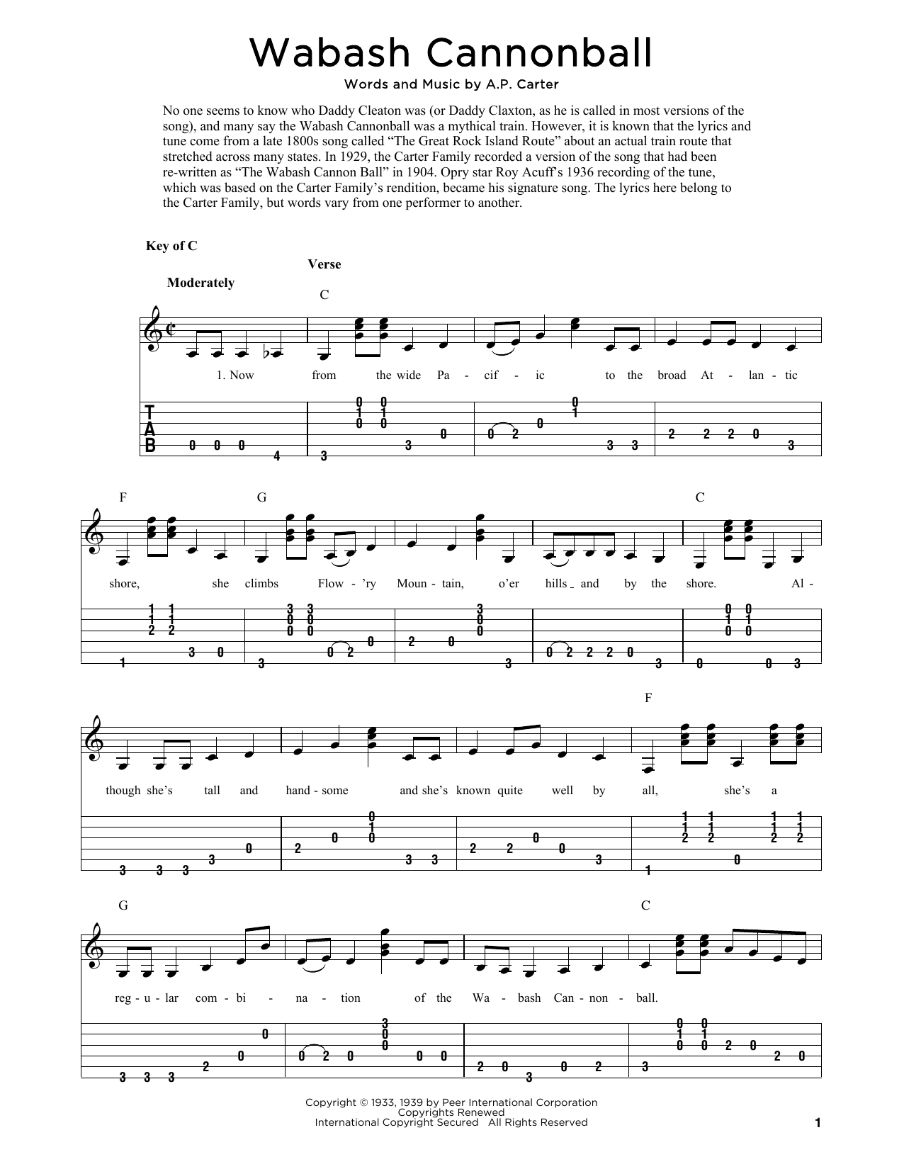 Download or print The Carter Family Wabash Cannonball (arr. Fred Sokolow) sheet music, chords and digital score arranged for Banjo Tab. This Country score includes 2 page(s).