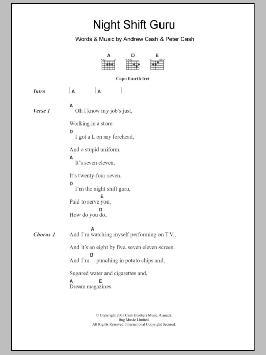 Download or print The Cash Brothers Night Shift Guru sheet music, chords and digital score arranged for Guitar Chords/Lyrics. This Country score includes 2 page(s).