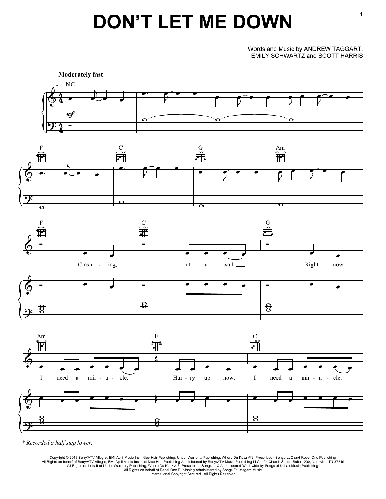 Download or print The Chainsmokers feat. Daya Don't Let Me Down sheet music, chords and digital score arranged for Piano, Vocal & Guitar Chords (Right-Hand Melody). This Pop score includes 7 page(s).