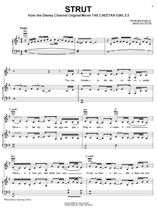 Download or print The Cheetah Girls Strut sheet music, chords and digital score arranged for Piano, Vocal & Guitar Chords (Right-Hand Melody). This Children score includes 7 page(s).