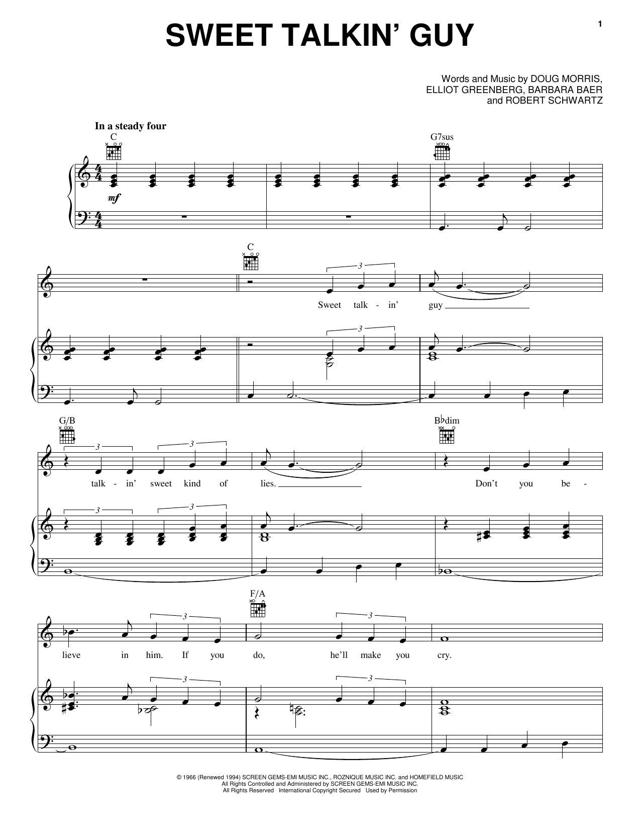 Download or print The Chiffons Sweet Talkin' Guy sheet music, chords and digital score arranged for Piano, Vocal & Guitar Chords (Right-Hand Melody). This Pop score includes 3 page(s).