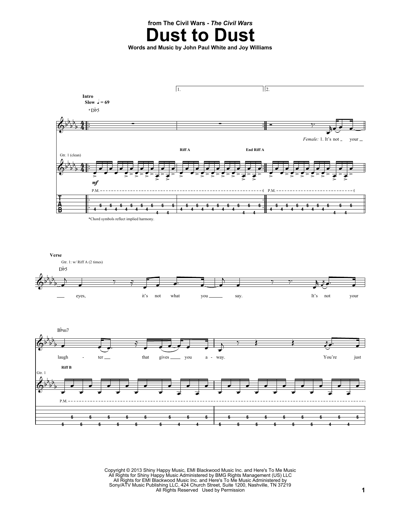 Download or print The Civil Wars Dust To Dust sheet music, chords and digital score arranged for Guitar Tab. This Pop score includes 6 page(s).