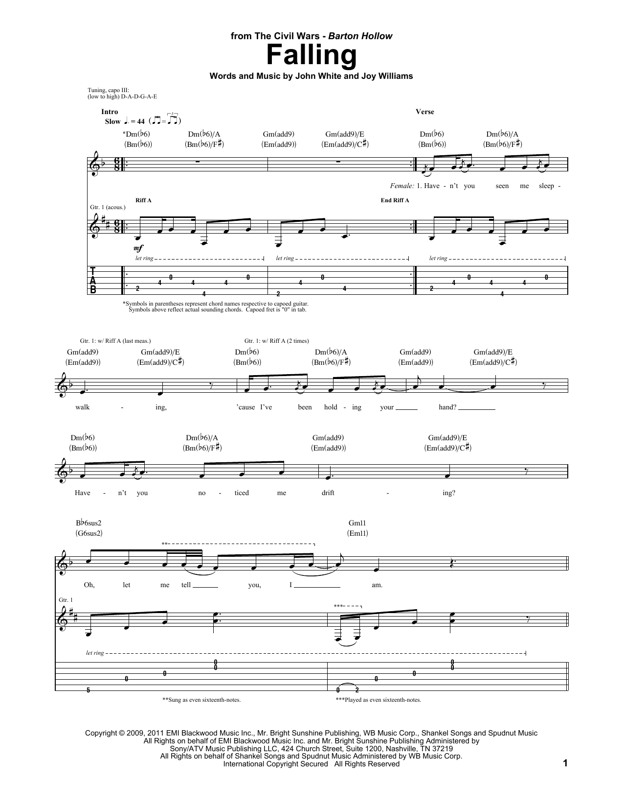 Download or print The Civil Wars Falling sheet music, chords and digital score arranged for Guitar Tab. This Folk score includes 6 page(s).