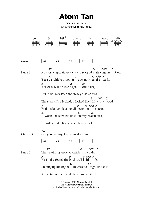 Download or print The Clash Atom Tan sheet music, chords and digital score arranged for Guitar Chords/Lyrics. This Rock score includes 2 page(s).