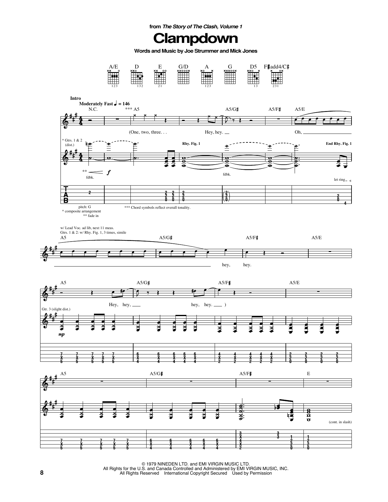 Download or print The Clash Clampdown sheet music, chords and digital score arranged for Guitar Chords/Lyrics. This Rock score includes 4 page(s).