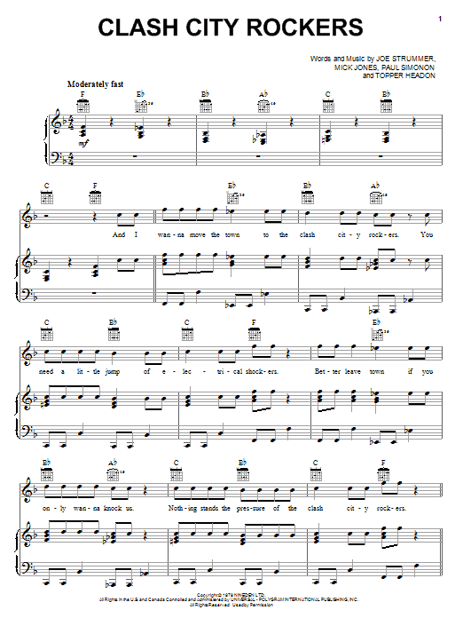 Download or print The Clash Clash City Rockers sheet music, chords and digital score arranged for Guitar Chords/Lyrics. This Rock score includes 3 page(s).