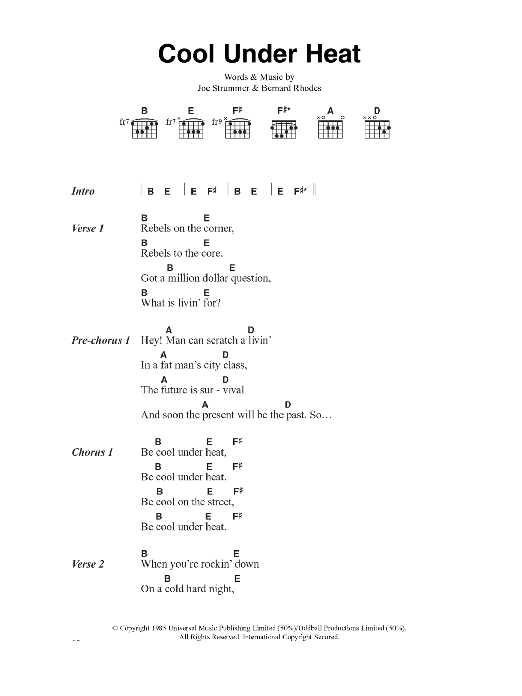 Download or print The Clash Cool Under Heat sheet music, chords and digital score arranged for Guitar Chords/Lyrics. This Rock score includes 2 page(s).