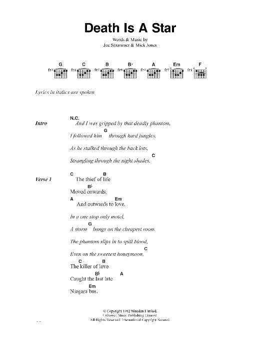 Download or print The Clash Death Is A Star sheet music, chords and digital score arranged for Guitar Chords/Lyrics. This Rock score includes 2 page(s).