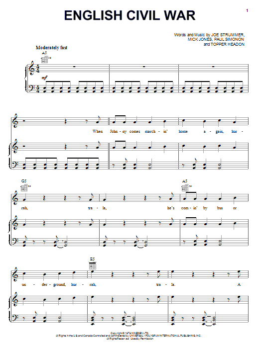 Download or print The Clash English Civil War sheet music, chords and digital score arranged for Guitar Chords/Lyrics. This Rock score includes 2 page(s).