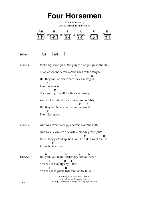 Download or print The Clash Four Horsemen sheet music, chords and digital score arranged for Guitar Chords/Lyrics. This Rock score includes 2 page(s).