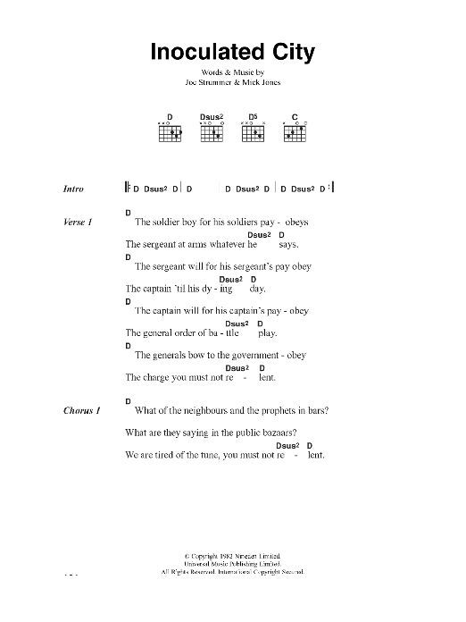 Download or print The Clash Inoculated City sheet music, chords and digital score arranged for Guitar Chords/Lyrics. This Rock score includes 2 page(s).