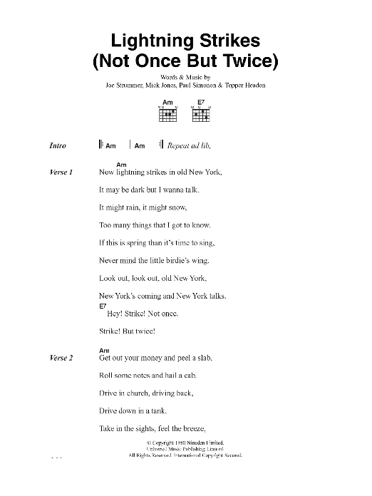Download or print The Clash Lightning Strikes (Not Once But Twice) sheet music, chords and digital score arranged for Guitar Chords/Lyrics. This Rock score includes 4 page(s).