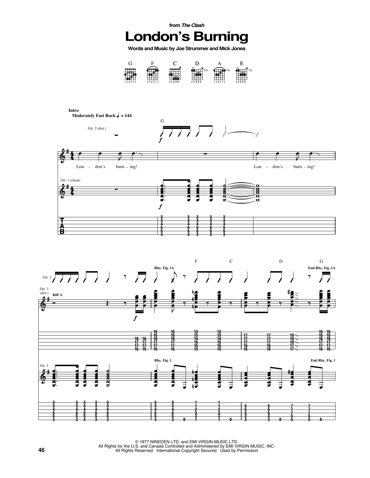 Download or print The Clash London's Burning sheet music, chords and digital score arranged for Guitar Chords/Lyrics. This Rock score includes 2 page(s).