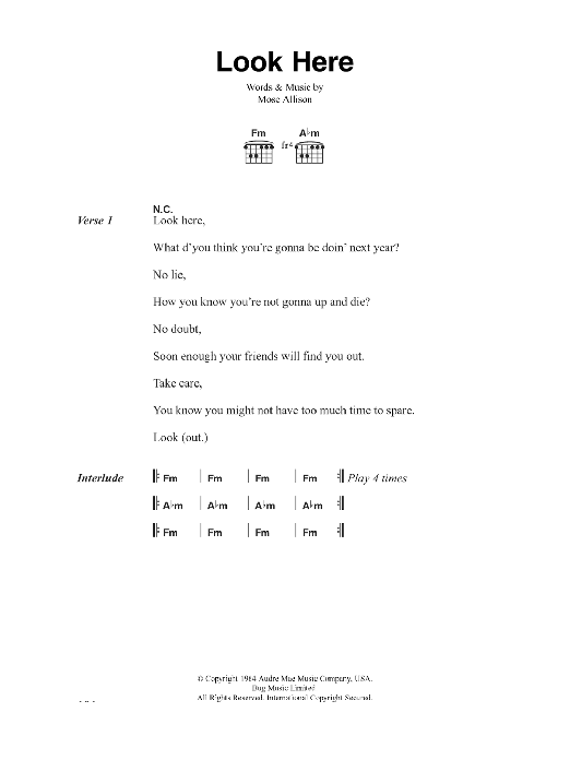 Download or print The Clash Look Here sheet music, chords and digital score arranged for Guitar Chords/Lyrics. This Rock score includes 2 page(s).