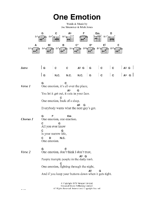 Download or print The Clash One Emotion sheet music, chords and digital score arranged for Guitar Chords/Lyrics. This Rock score includes 2 page(s).