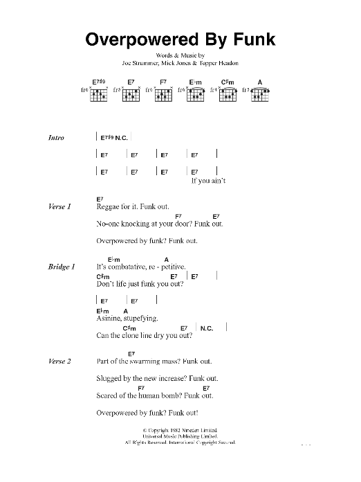Download or print The Clash Overpowered By Funk sheet music, chords and digital score arranged for Guitar Chords/Lyrics. This Rock score includes 3 page(s).