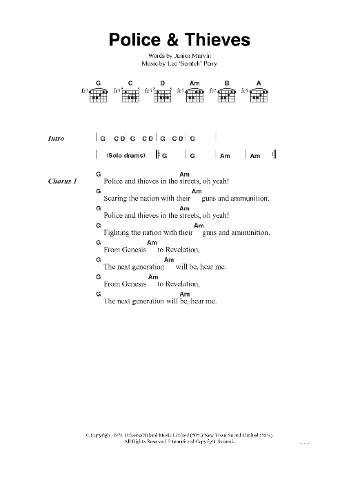 Download or print The Clash Police And Thieves sheet music, chords and digital score arranged for Guitar Chords/Lyrics. This Rock score includes 3 page(s).