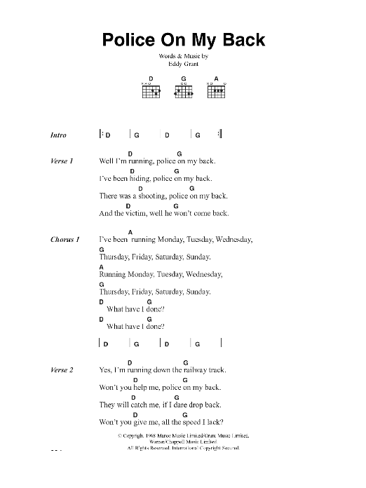 Download or print The Clash Police On My Back sheet music, chords and digital score arranged for Guitar Chords/Lyrics. This Rock score includes 2 page(s).