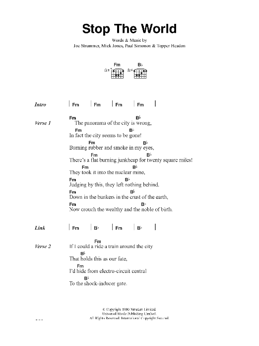 Download or print The Clash Stop The World sheet music, chords and digital score arranged for Guitar Chords/Lyrics. This Rock score includes 2 page(s).