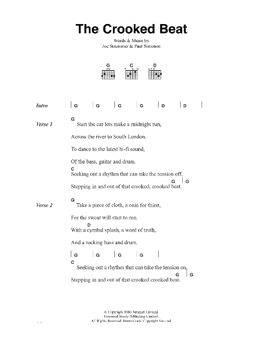 Download or print The Clash The Crooked Beat sheet music, chords and digital score arranged for Guitar Chords/Lyrics. This Rock score includes 2 page(s).