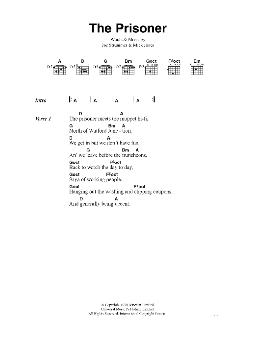 Download or print The Clash The Prisoner sheet music, chords and digital score arranged for Guitar Chords/Lyrics. This Rock score includes 3 page(s).