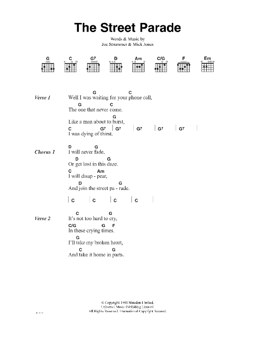 Download or print The Clash The Street Parade sheet music, chords and digital score arranged for Guitar Chords/Lyrics. This Rock score includes 2 page(s).